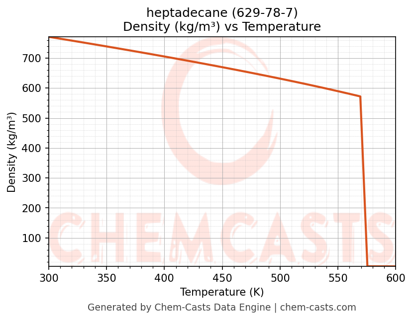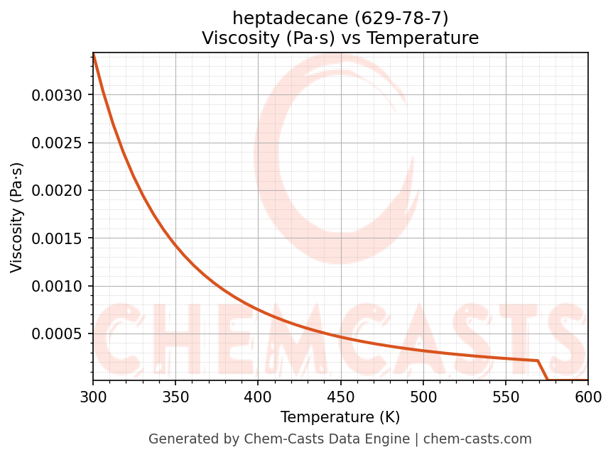 This page presents the temperature-dependent thermodynamic and transport properties of heptadecane (CAS 629-78-7) calculated at a constant pressure of 1 atm (101325 Pa) over the temperature range 250-500 K.