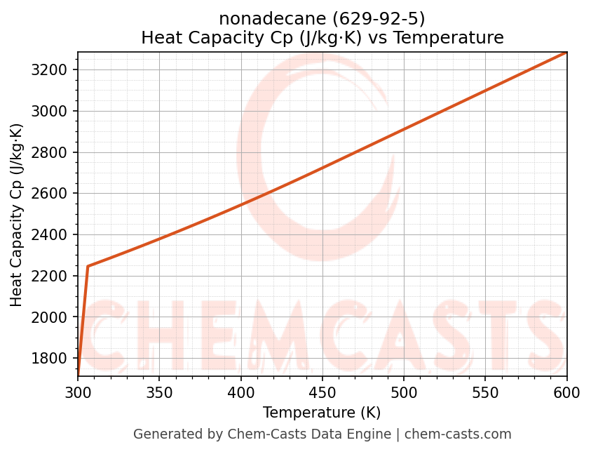 - Specific heat capacity (Cp) indicates the amount of energy required to raise the temperature of nonadecane and is critical for energy balance and heat-exchanger design.