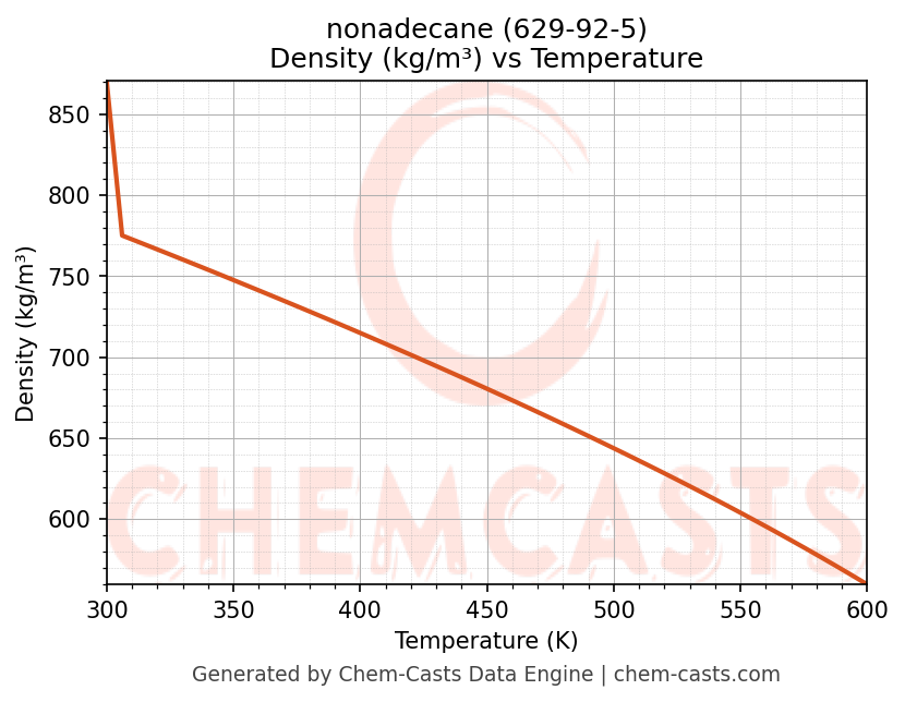 This page presents the temperature-dependent thermodynamic and transport properties of nonadecane (CAS 629-92-5) calculated at a constant pressure of 1 atm (101325 Pa) over the temperature range 250-500 K.