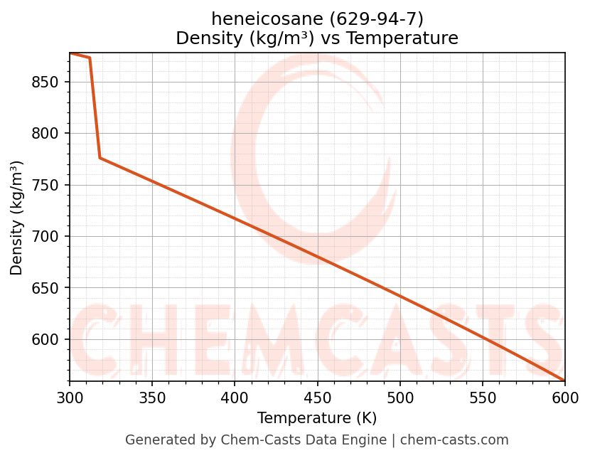 This page presents the temperature-dependent thermodynamic and transport properties of heneicosane (CAS 629-94-7) calculated at a constant pressure of 1 atm (101325 Pa) over the temperature range 250-500 K.