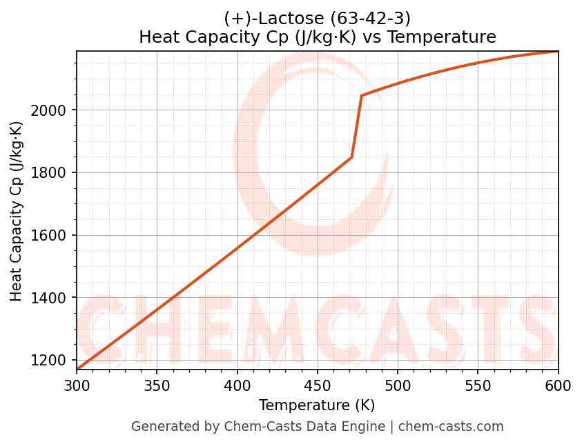 - Specific heat capacity (Cp) indicates the amount of energy required to raise the temperature of (+)-Lactose and is critical for energy balance and heat-exchanger design.