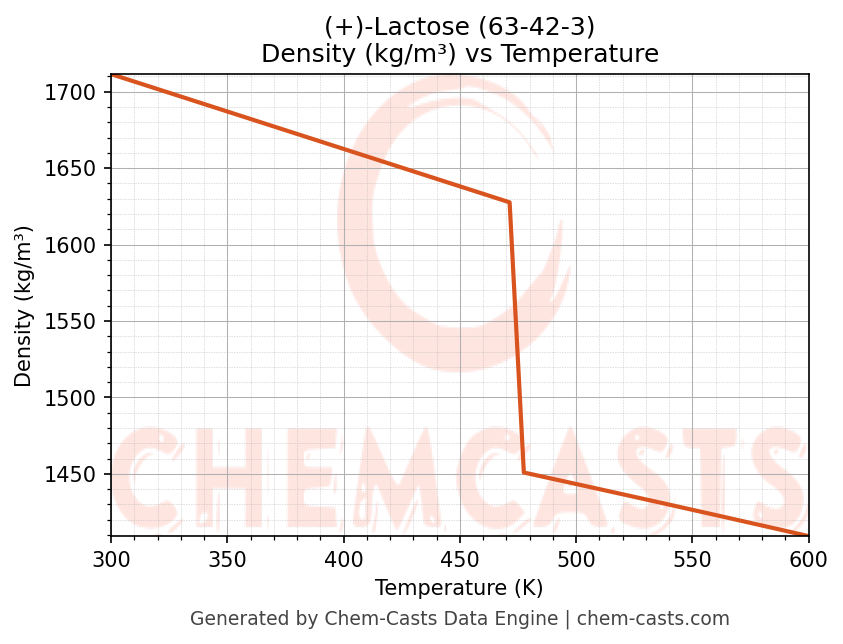 This page presents the temperature-dependent thermodynamic and transport properties of (+)-Lactose (CAS 63-42-3) calculated at a constant pressure of 1 atm (101325 Pa) over the temperature range 250-500 K.