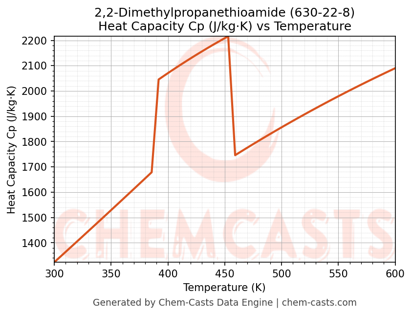 - Specific heat capacity (Cp) indicates the amount of energy required to raise the temperature of 2,2-Dimethylpropanethioamide and is critical for energy balance and heat-exchanger design.