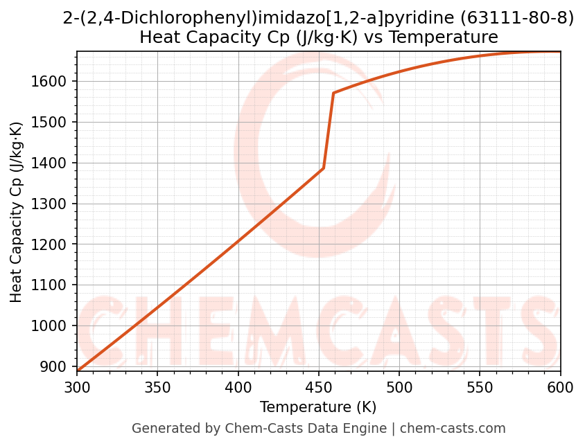![Heat Capacity (Cp) vs Temperature chart for 2-(2,4-Dichlorophenyl)imidazo[1,2-a]pyridine (CAS 63111-80-8)](https://chemcasts-prod.s3.ap-south-1.amazonaws.com/chem_plots_pconst/63111-80-8-cp.png)