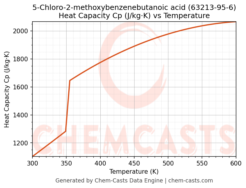 - Specific heat capacity (Cp) indicates the amount of energy required to raise the temperature of 5-Chloro-2-methoxybenzenebutanoic acid and is critical for energy balance and heat-exchanger design.