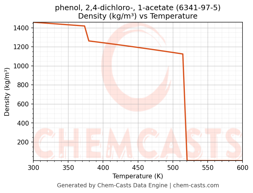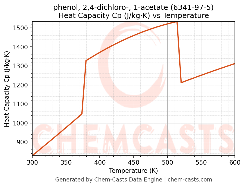 - Specific heat capacity (Cp) indicates the amount of energy required to raise the temperature of phenol, 2,4-dichloro-, 1-acetate and is critical for energy balance and heat-exchanger design.