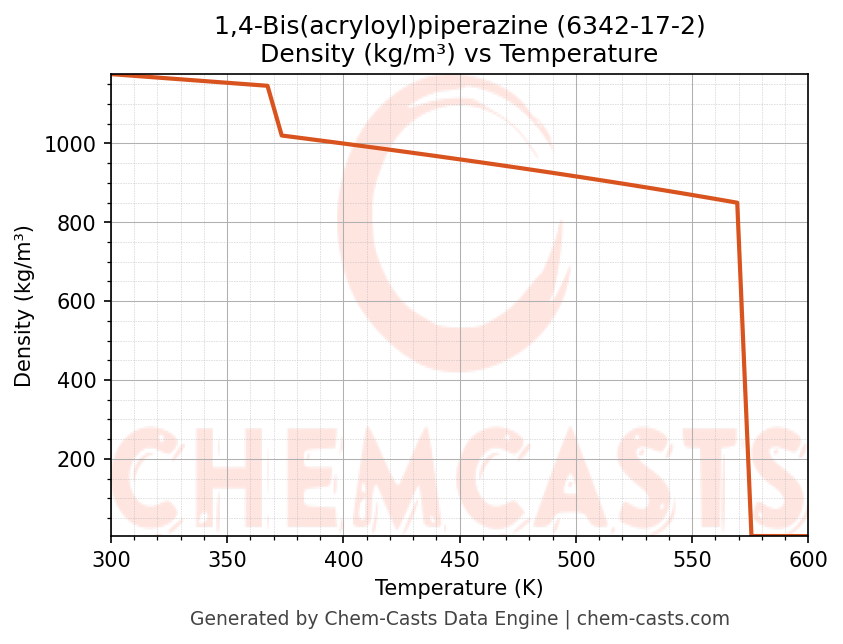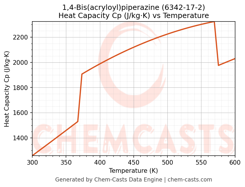 This page presents the temperature-dependent thermodynamic and transport properties of 1,4-Bis(acryloyl)piperazine (CAS 6342-17-2) calculated at a constant pressure of 1 atm (101325 Pa) over the temperature range 250-500 K.