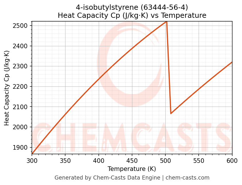- Specific heat capacity (Cp) indicates the amount of energy required to raise the temperature of 4-isobutylstyrene and is critical for energy balance and heat-exchanger design.
