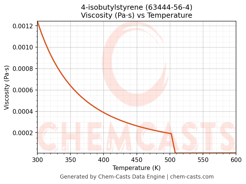 This page presents the temperature-dependent thermodynamic and transport properties of 4-isobutylstyrene (CAS 63444-56-4) calculated at a constant pressure of 1 atm (101325 Pa) over the temperature range 250-500 K.