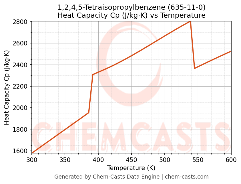 - Specific heat capacity (Cp) indicates the amount of energy required to raise the temperature of 1,2,4,5-Tetraisopropylbenzene and is critical for energy balance and heat-exchanger design.