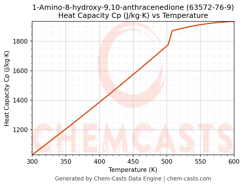 - Specific heat capacity (Cp) indicates the amount of energy required to raise the temperature of 1-Amino-8-hydroxy-9,10-anthracenedione and is critical for energy balance and heat-exchanger design.