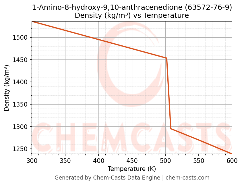 This page presents the temperature-dependent thermodynamic and transport properties of 1-Amino-8-hydroxy-9,10-anthracenedione (CAS 63572-76-9) calculated at a constant pressure of 1 atm (101325 Pa) over the temperature range 250-500 K.