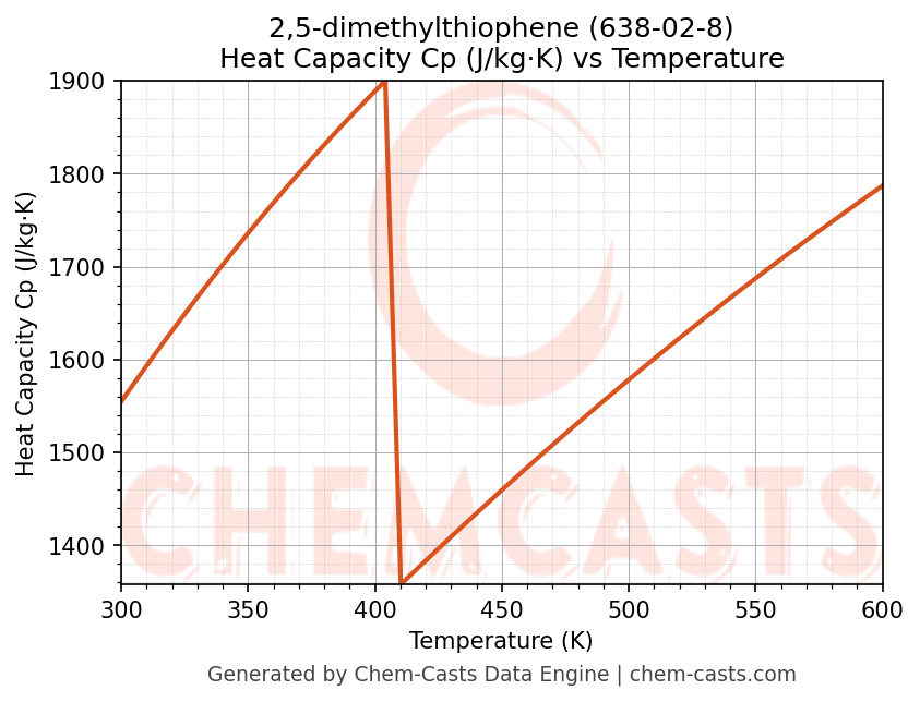 - Specific heat capacity (Cp) indicates the amount of energy required to raise the temperature of 2,5-dimethylthiophene and is critical for energy balance and heat-exchanger design.