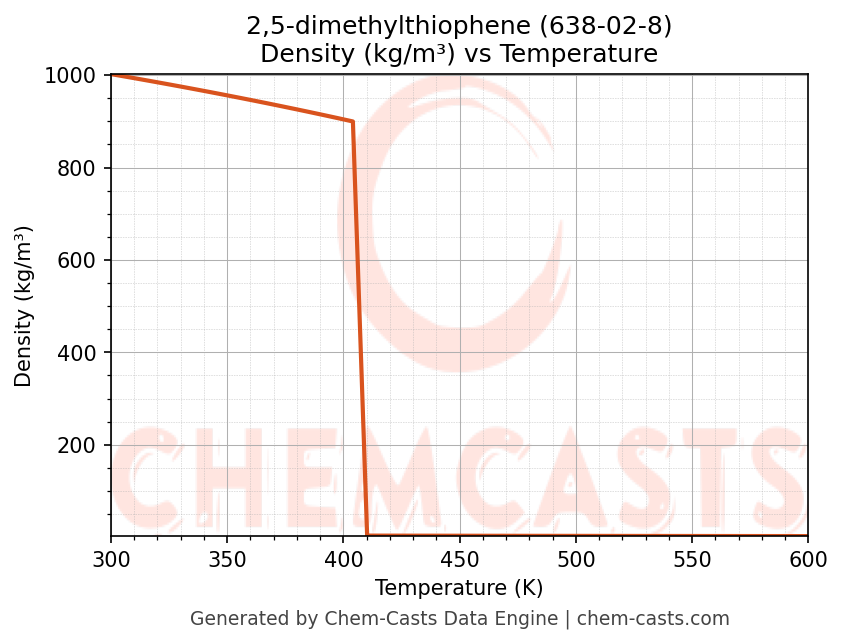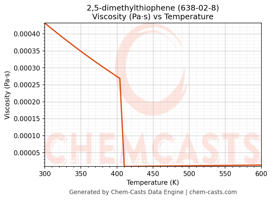 This page presents the temperature-dependent thermodynamic and transport properties of 2,5-dimethylthiophene (CAS 638-02-8) calculated at a constant pressure of 1 atm (101325 Pa) over the temperature range 250-500 K.