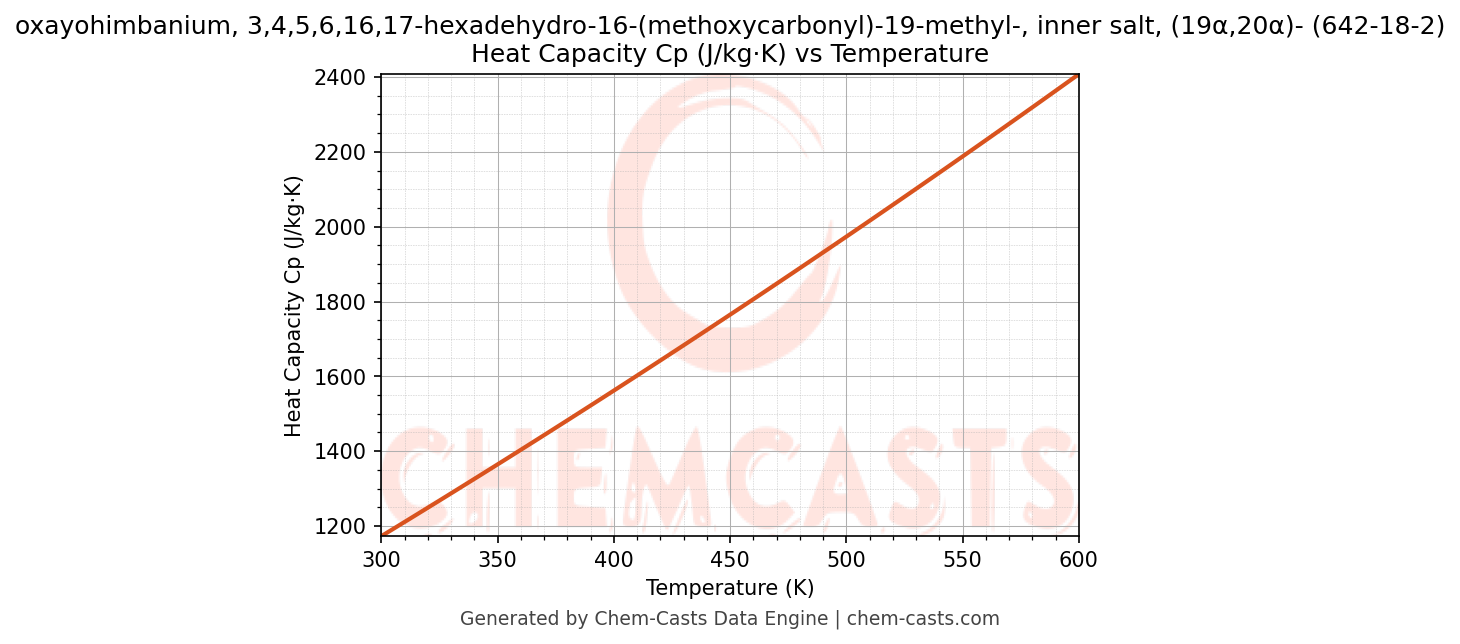 - Specific heat capacity (Cp) indicates the amount of energy required to raise the temperature of oxayohimbanium, 3,4,5,6,16,17-hexadehydro-16-(methoxycarbonyl)-19-methyl-, inner salt, (19α,20α)- and is critical for energy balance and heat-exchanger design.