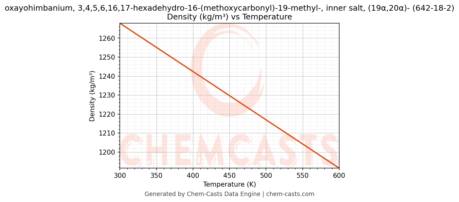 This page presents the temperature-dependent thermodynamic and transport properties of oxayohimbanium, 3,4,5,6,16,17-hexadehydro-16-(methoxycarbonyl)-19-methyl-, inner salt, (19α,20α)- (CAS 642-18-2) calculated at a constant pressure of 1 atm (101325 Pa) over the temperature range 250-500 K.