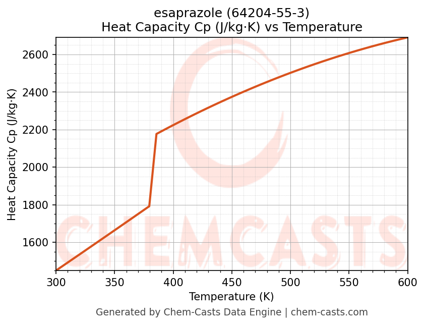 - Specific heat capacity (Cp) indicates the amount of energy required to raise the temperature of esaprazole and is critical for energy balance and heat-exchanger design.