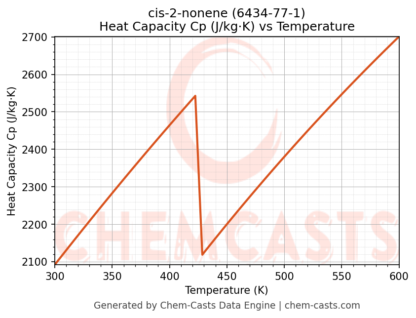 - Specific heat capacity (Cp) indicates the amount of energy required to raise the temperature of cis-2-nonene and is critical for energy balance and heat-exchanger design.