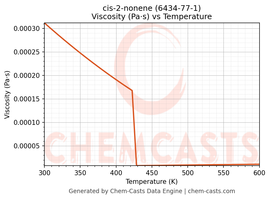 This page presents the temperature-dependent thermodynamic and transport properties of cis-2-nonene (CAS 6434-77-1) calculated at a constant pressure of 1 atm (101325 Pa) over the temperature range 250-500 K.
