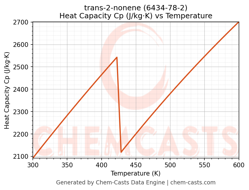 - Specific heat capacity (Cp) indicates the amount of energy required to raise the temperature of trans-2-nonene and is critical for energy balance and heat-exchanger design.