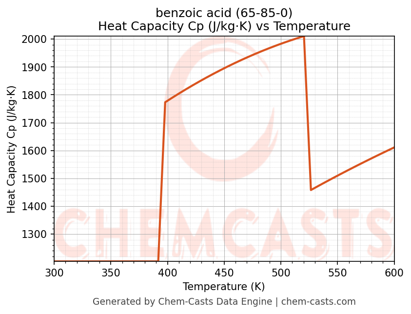 - Specific heat capacity (Cp) indicates the amount of energy required to raise the temperature of benzoic acid and is critical for energy balance and heat-exchanger design.