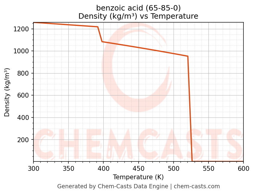 This page presents the temperature-dependent thermodynamic and transport properties of benzoic acid (CAS 65-85-0) calculated at a constant pressure of 1 atm (101325 Pa) over the temperature range 250-500 K.