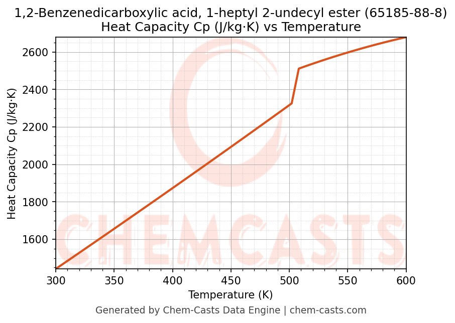 - Specific heat capacity (Cp) indicates the amount of energy required to raise the temperature of 1,2-Benzenedicarboxylic acid, 1-heptyl 2-undecyl ester and is critical for energy balance and heat-exchanger design.
