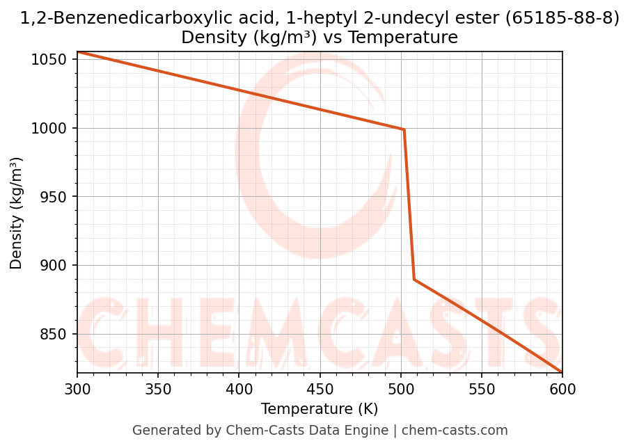 This page presents the temperature-dependent thermodynamic and transport properties of 1,2-Benzenedicarboxylic acid, 1-heptyl 2-undecyl ester (CAS 65185-88-8) calculated at a constant pressure of 1 atm (101325 Pa) over the temperature range 250-500 K.