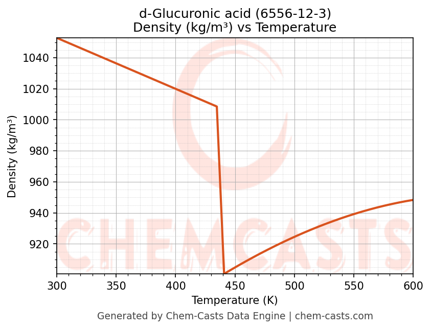 This page presents the temperature-dependent thermodynamic and transport properties of d-Glucuronic acid (CAS 6556-12-3) calculated at a constant pressure of 1 atm (101325 Pa) over the temperature range 250-500 K.