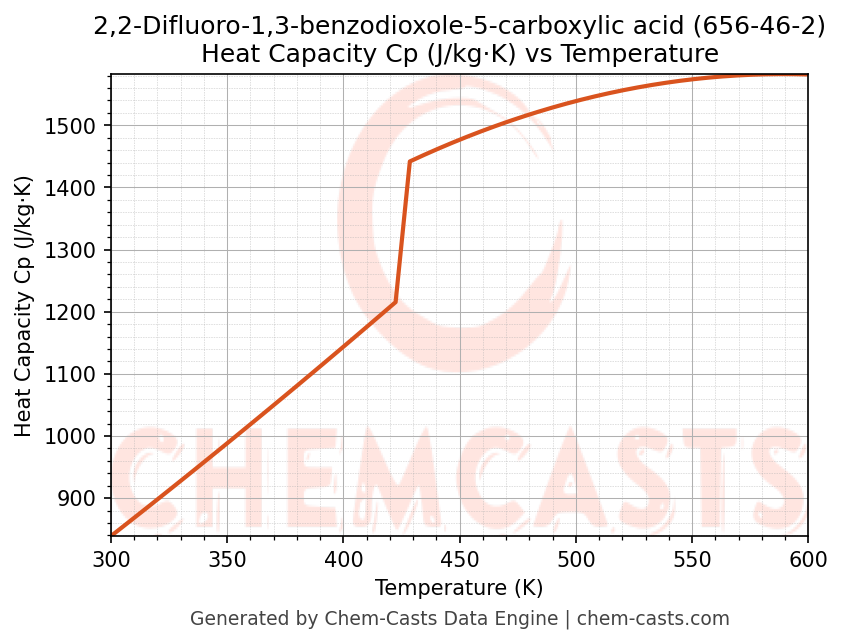 - Specific heat capacity (Cp) indicates the amount of energy required to raise the temperature of 2,2-Difluoro-1,3-benzodioxole-5-carboxylic acid and is critical for energy balance and heat-exchanger design.