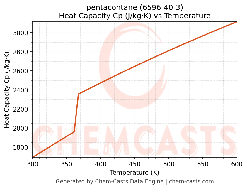 - Specific heat capacity (Cp) indicates the amount of energy required to raise the temperature of pentacontane and is critical for energy balance and heat-exchanger design.