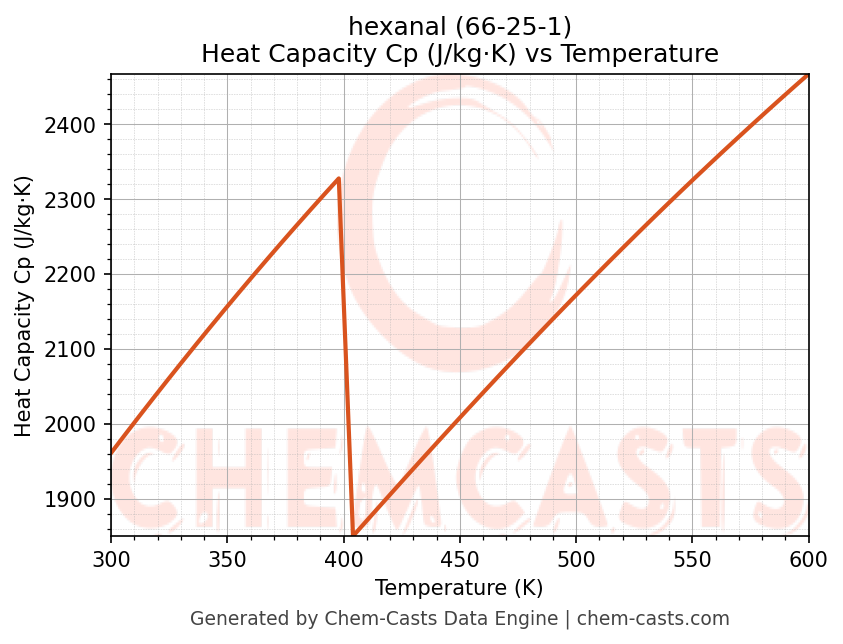 - Specific heat capacity (Cp) indicates the amount of energy required to raise the temperature of hexanal and is critical for energy balance and heat-exchanger design.