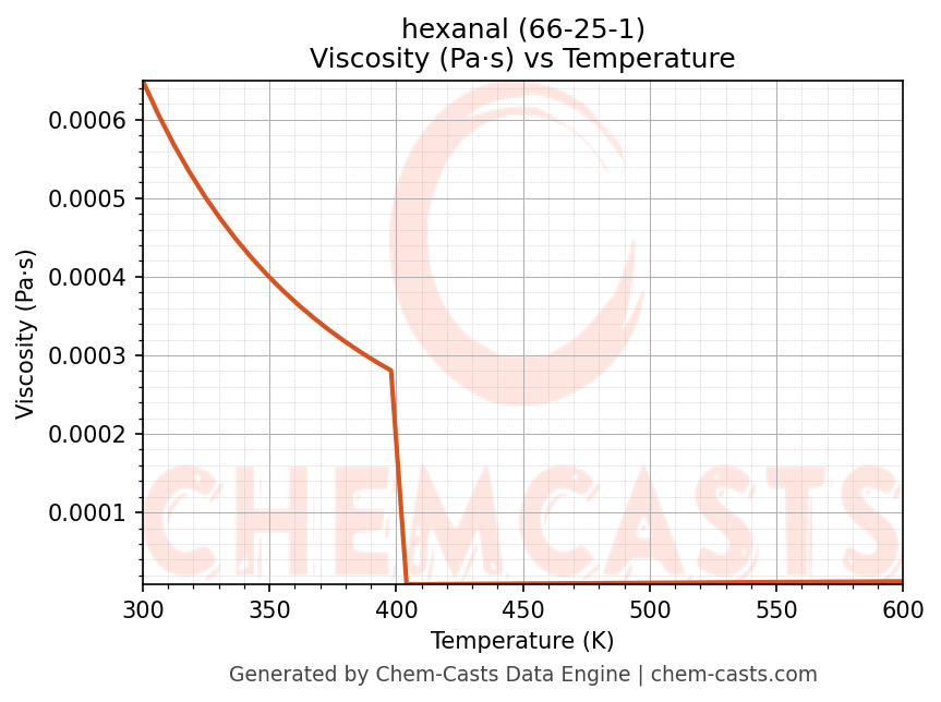 This page presents the temperature-dependent thermodynamic and transport properties of hexanal (CAS 66-25-1) calculated at a constant pressure of 1 atm (101325 Pa) over the temperature range 250-500 K.