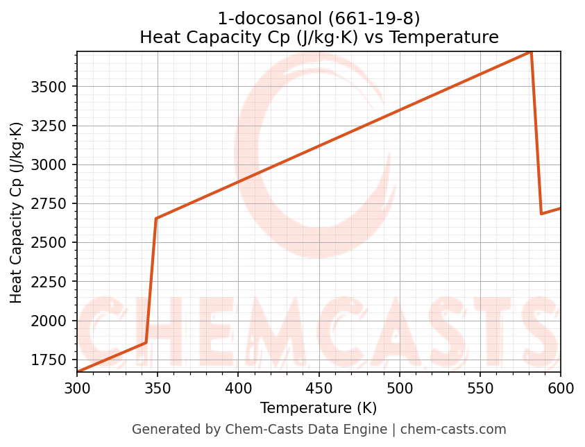- Specific heat capacity (Cp) indicates the amount of energy required to raise the temperature of 1-docosanol and is critical for energy balance and heat-exchanger design.