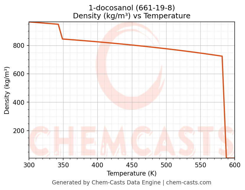 This page presents the temperature-dependent thermodynamic and transport properties of 1-docosanol (CAS 661-19-8) calculated at a constant pressure of 1 atm (101325 Pa) over the temperature range 250-500 K.