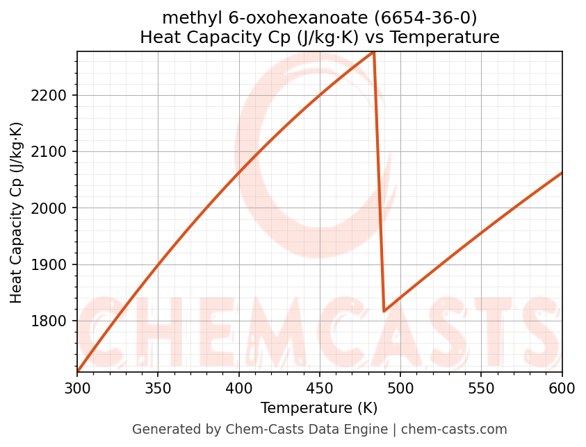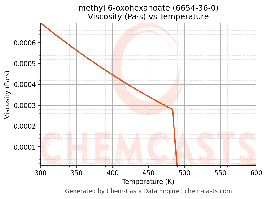 This page presents the temperature-dependent thermodynamic and transport properties of methyl 6-oxohexanoate (CAS 6654-36-0) calculated at a constant pressure of 1 atm (101325 Pa) over the temperature range 250-500 K.