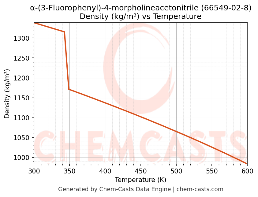 This page presents the temperature-dependent thermodynamic and transport properties of α-(3-Fluorophenyl)-4-morpholineacetonitrile (CAS 66549-02-8) calculated at a constant pressure of 1 atm (101325 Pa) over the temperature range 250-500 K.