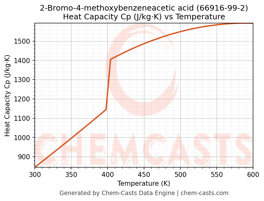 - Specific heat capacity (Cp) indicates the amount of energy required to raise the temperature of 2-Bromo-4-methoxybenzeneacetic acid and is critical for energy balance and heat-exchanger design.