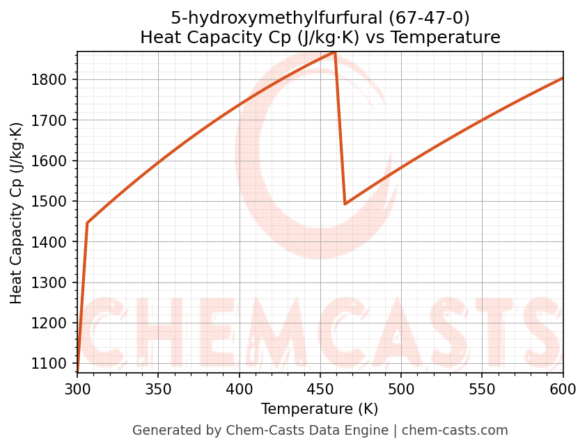 - Specific heat capacity (Cp) indicates the amount of energy required to raise the temperature of 5-hydroxymethylfurfural and is critical for energy balance and heat-exchanger design.