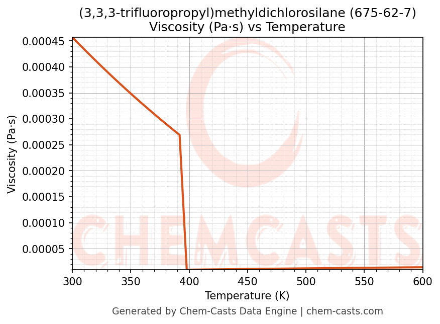 This page presents the temperature-dependent thermodynamic and transport properties of (3,3,3-trifluoropropyl)methyldichlorosilane (CAS 675-62-7) calculated at a constant pressure of 1 atm (101325 Pa) over the temperature range 250-500 K.