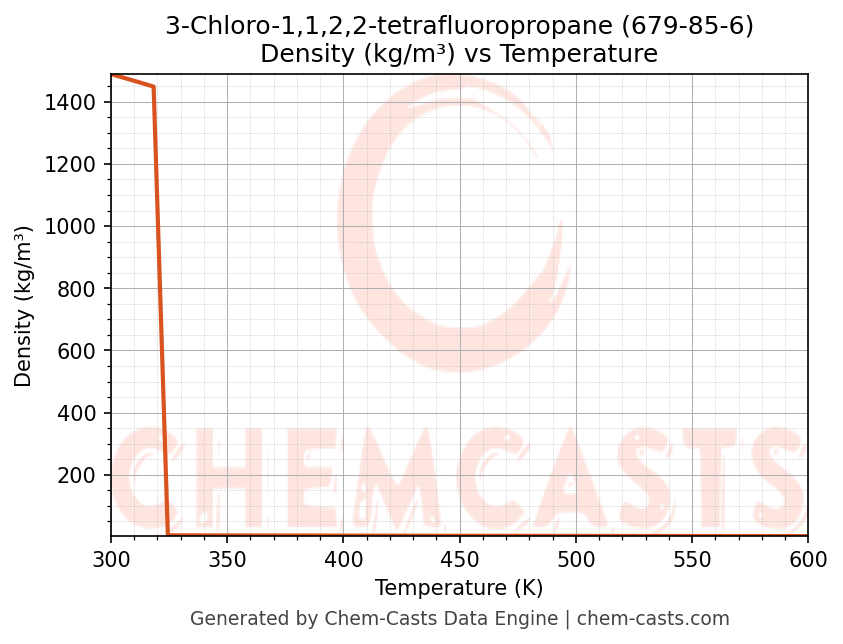 This page presents the temperature-dependent thermodynamic and transport properties of 3-Chloro-1,1,2,2-tetrafluoropropane (CAS 679-85-6) calculated at a constant pressure of 1 atm (101325 Pa) over the temperature range 250-500 K.
