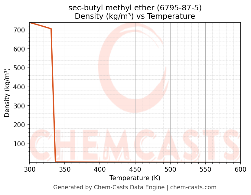 This page presents the temperature-dependent thermodynamic and transport properties of sec-butyl methyl ether (CAS 6795-87-5) calculated at a constant pressure of 1 atm (101325 Pa) over the temperature range 250-500 K.