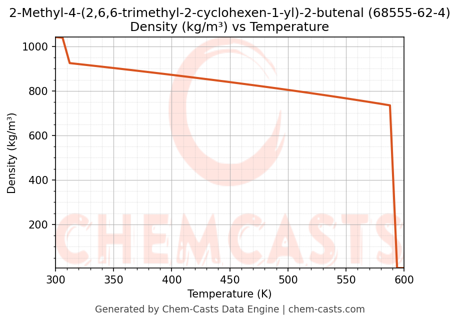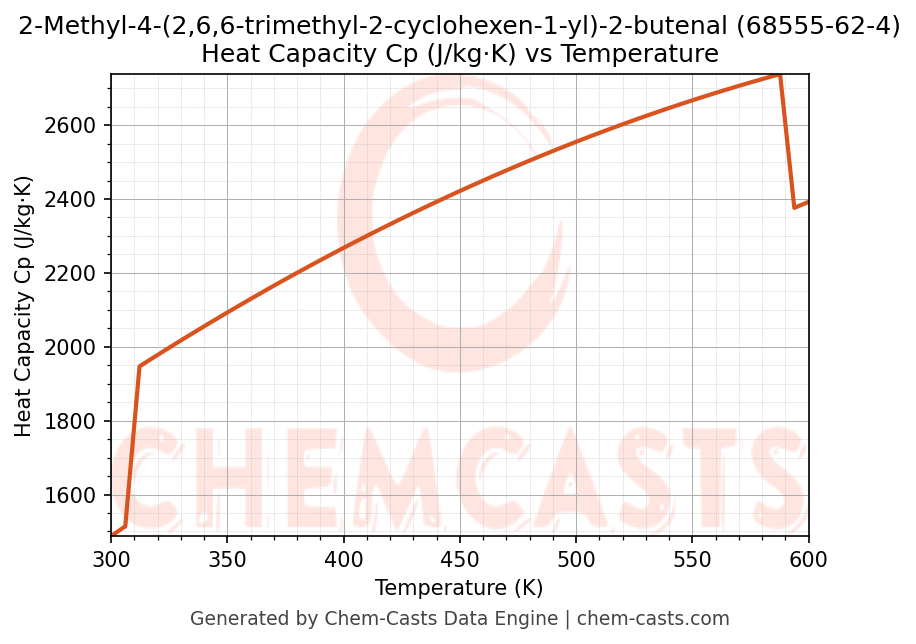 - Specific heat capacity (Cp) indicates the amount of energy required to raise the temperature of 2-Methyl-4-(2,6,6-trimethyl-2-cyclohexen-1-yl)-2-butenal and is critical for energy balance and heat-exchanger design.