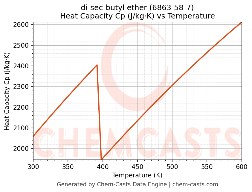 - Specific heat capacity (Cp) indicates the amount of energy required to raise the temperature of di-sec-butyl ether and is critical for energy balance and heat-exchanger design.
