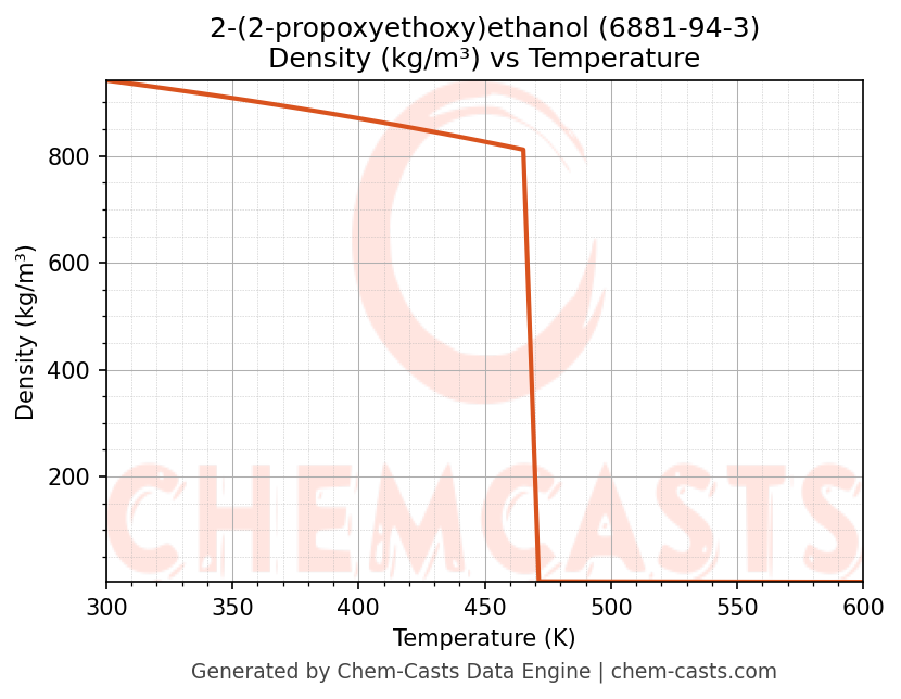 This page presents the temperature-dependent thermodynamic and transport properties of 2-(2-propoxyethoxy)ethanol (CAS 6881-94-3) calculated at a constant pressure of 1 atm (101325 Pa) over the temperature range 250-500 K.