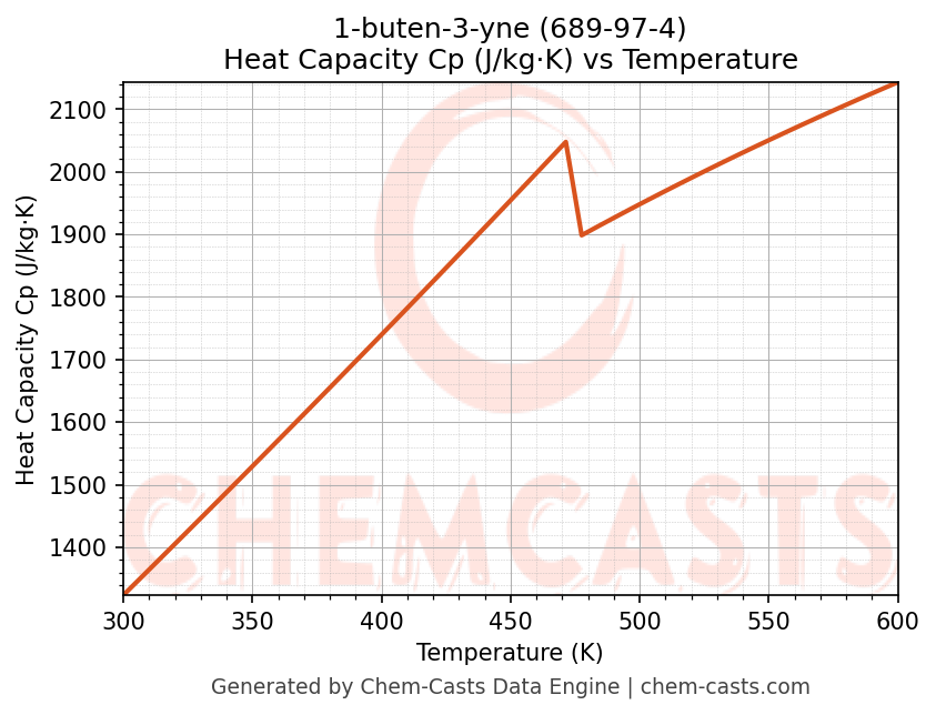 - Specific heat capacity (Cp) indicates the amount of energy required to raise the temperature of 1-buten-3-yne and is critical for energy balance and heat-exchanger design.