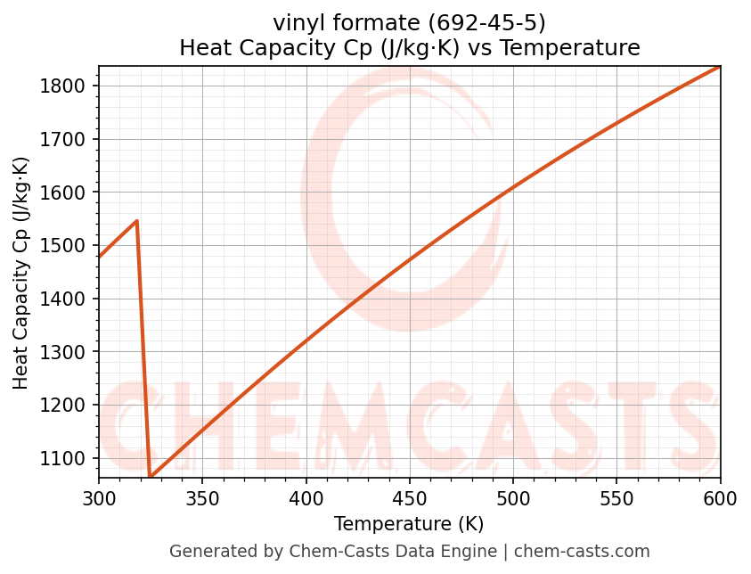 - Specific heat capacity (Cp) indicates the amount of energy required to raise the temperature of vinyl formate and is critical for energy balance and heat-exchanger design.