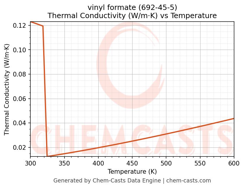 This page presents the temperature-dependent thermodynamic and transport properties of vinyl formate (CAS 692-45-5) calculated at a constant pressure of 1 atm (101325 Pa) over the temperature range 250-500 K.