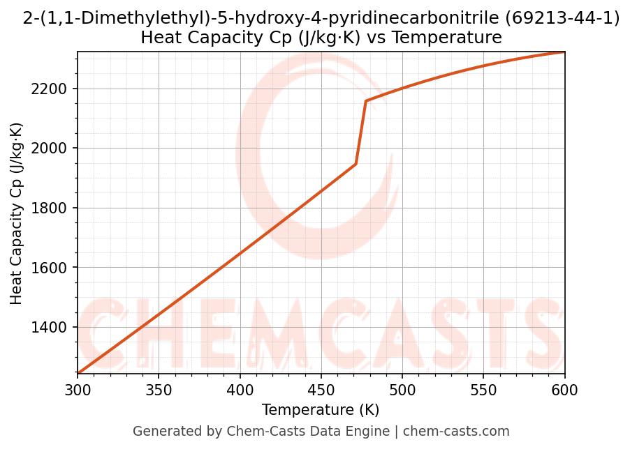 - Specific heat capacity (Cp) indicates the amount of energy required to raise the temperature of 2-(1,1-Dimethylethyl)-5-hydroxy-4-pyridinecarbonitrile and is critical for energy balance and heat-exchanger design.