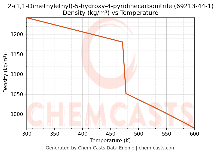 This page presents the temperature-dependent thermodynamic and transport properties of 2-(1,1-Dimethylethyl)-5-hydroxy-4-pyridinecarbonitrile (CAS 69213-44-1) calculated at a constant pressure of 1 atm (101325 Pa) over the temperature range 250-500 K.